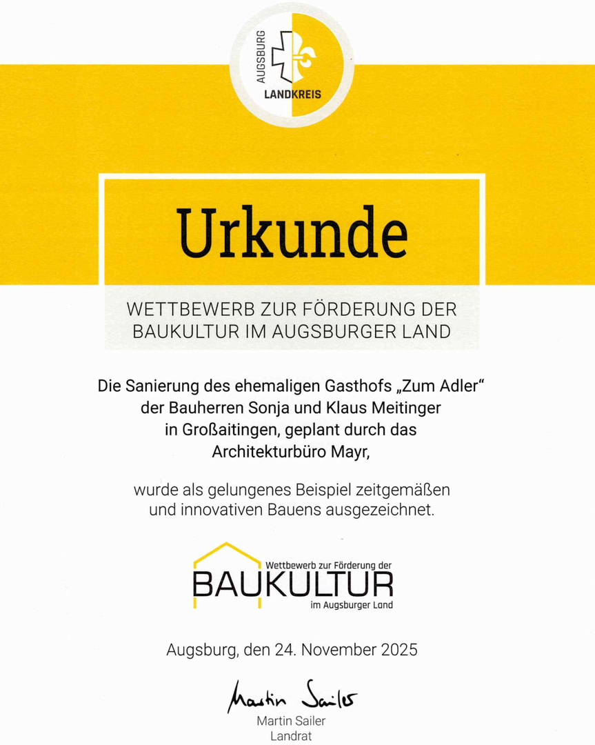 Auszeichnung des Bauwerks beim Wettbewerb zur Förderung der Baukultur im Augsburger Land 2025.